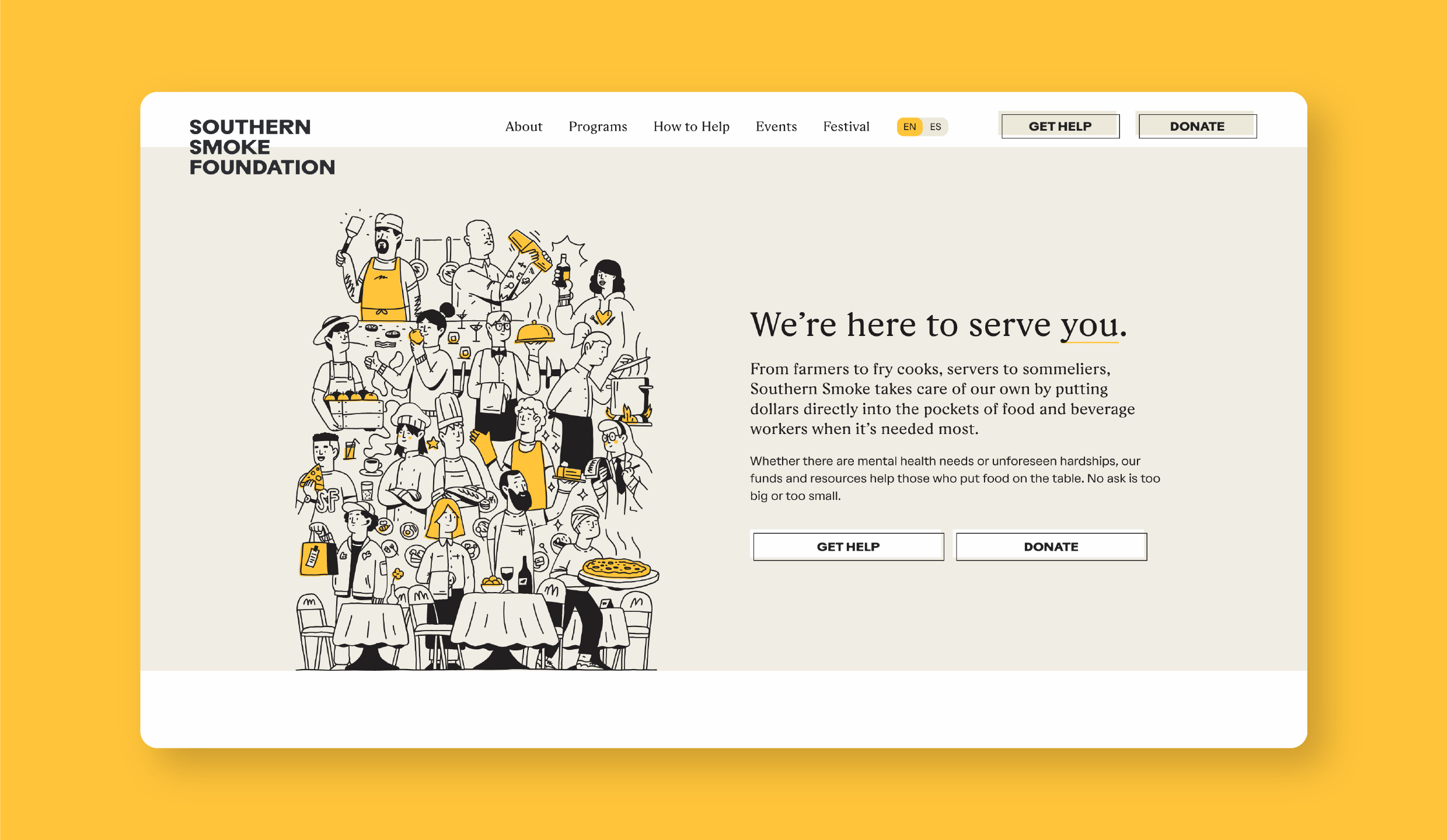 Working with amazing creatives at Principle to craft illustrations to follow the rebranding of one of the nicest nonprofits, Southern Smoke Foundation. Started by chef Chris Shepherd in 2015, the nonprofit “takes care of our own” by putting dollars directly into the pockets of food and beverage (F+B) workers in crisis—from farmers and fry cooks to servers and sommeliers—to serve as a safety net in an industry where one rarely exists.